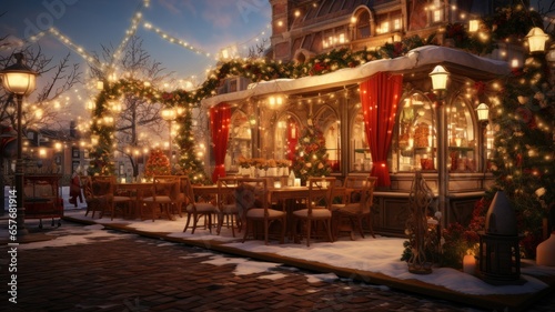 the holiday market as the sun sets and the festive lights begin to illuminate the scene. the warm, cozy ambiance created by the twinkling lights.