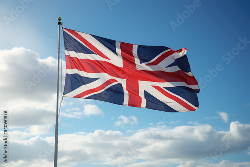 The iconic union jack flag proudly waves under a clear blue sky, symbolizing british identity and national pride.