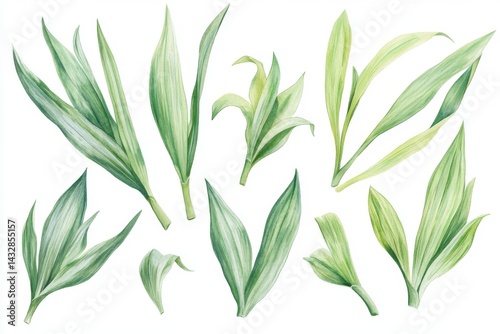 The illustration features a tropical leaf set, including a palm leaf, in a watercolor painting style, showcasing a green plant on a clean white background, classified under jungle clipart