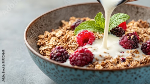 The image captures a ceramic bowl filled with granola, raspberries, and blackberries while milk is being poured, highlighting a wholesome and nutritious breakfast scene.