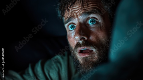 The image captures a shocked man with intense blue eyes and a surprised expression, showcasing fear and curiosity against a dark, shadowy background that suggests suspense.