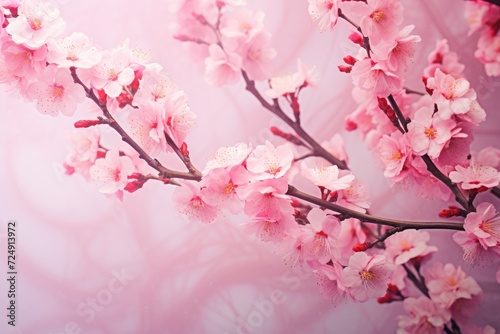 The image captures the exquisite beauty of delicate pink flowers blooming on a close-up view of a branch, Sakura, Cherry blossom, Spring flowers, Floral background, AI Generated