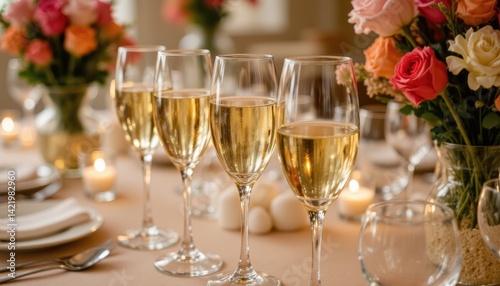 The image depicts a beautifully set table with crystal champagne flutes filled with bubbly champagne