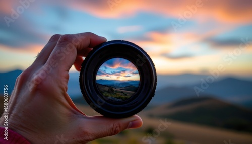 the image depicts a close up of a camera lens with the photographers hand holding it from the side
