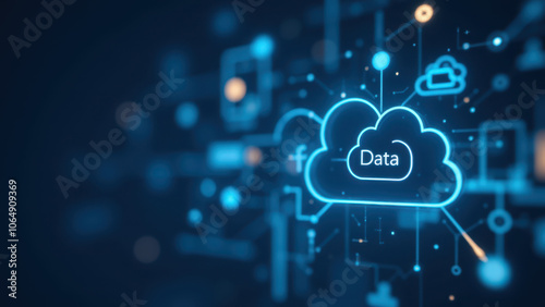 The image depicts a digital cloud concept with a blue-toned backdrop featuring abstract shapes and patterns that resemble digital connectivity or circuitry.