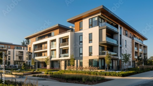 The image depicts a modern apartment complex with three-story buildings featuring large windows, glass balconies, and a mix of tan and grey exteriors. Surrounding greenery, stone paths,