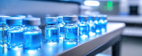 The image features several glass vials filled with blue liquid, illuminated under a soft light, suggesting a laboratory or medical setting.