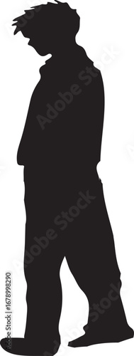 silhouette, person, male, female, human, figure, standing, back, pant, jacket, shirt, casual attire, relaxed, posture, black, white, simple, minimalist, graphic, art, illustration, vector, design, style, fashion, anonymous, mysterious, unknown, solitary, lonely, alone, mood, feeling, emotion, expression, attitude, pose, shape, form, outline, abstract, contemporary, modern