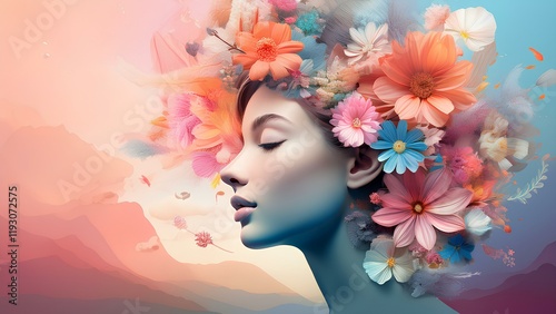 The image is an artistic depiction of a woman's face mixed with blooming flowers, creating a surreal fusion of nature and beauty. The soft pastel tones add a dreamy and ethereal quality.