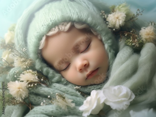 baby, newborn, wrapped, sleeping, innocence, purity, sweetness, angelic, pristine, peaceful, nurturing, care, protection, dream, lullaby, gentleness, adorable, infant, love