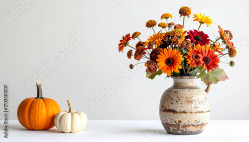 the image showcases an arrangement on a clean surface against a light backdrop. a ceramic jug like vase filled with flowers in various shades of orange and red stands prominently to the right