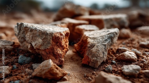The image showcases broken rock formations scattered over a dry landscape, highlighting their rugged texture and earthy tones, representing nature's raw beauty.
