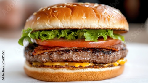 The image shows a classic burger with fresh toppings such as lettuce, tomato, and cheese, served on a white tray. The perfect depiction of a satisfying meal.