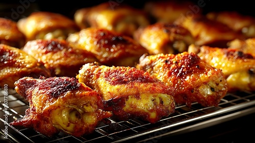 show, close, up, cooked, chicken, piece, displaying, gold, brown, exterior, these, arranged, row, wire, rack, they, baked, grilled, coating, glazed, some, texture, than, other, dark, background, dramatic, contrast, highlight, focal, point, food, meat, bar-b-q, grill, meal, pork meat, dinner, beef, cooking, steak, roasted, roast