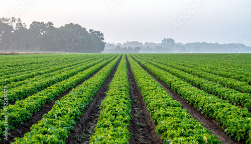 agriculture, farming, cultivation, field, crop, greenery, growth, row, pattern, horizon, distance, landscape, organised, structured, aligned, vibrant, expansive, hazy, sky, tree, nature, rural, countryside, harvest, abundance, beauty, serene, peaceful, lush, bountiful