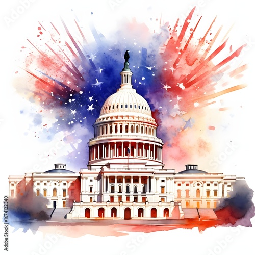 watercolor, painting, illustration, capitol, building, us, america, dome, architecture, patriotic, flag, star, red, white, blue, colours, burst, design, art, artwork, graphic, image, visual, abstract, modern, landscape, historical building, government, politic, history, culture, american, national, symbol, landmark, iconic, drawing, artistic, creative, fine art, hi-res, vibrant, expressive