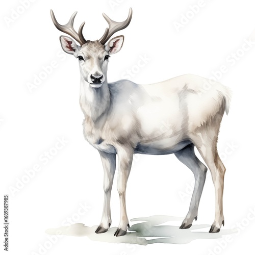 The image shows a white deer with antlers, depicted in a watercolor painting style against a white background.