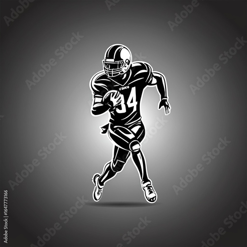 The image shows an American football player running with the ball, wearing a helmet and jersey number 34. The black and white design highlights action, strength, and athletic determination.