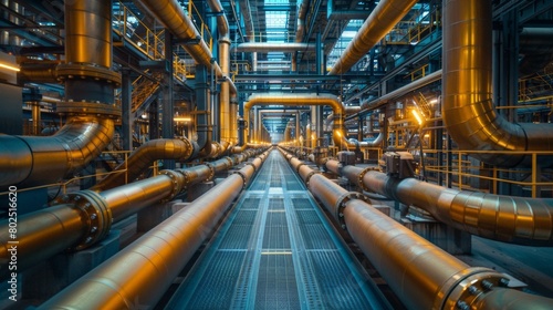 The innards of a factory are a maze of pipes and catwalks. AI.
