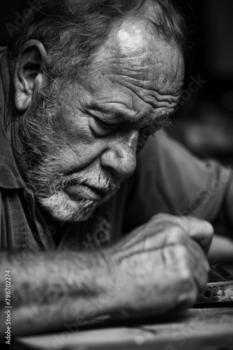 The intense focus and concentration etched into a man's face as he works on a challenging task, his brow furrowed in determination.