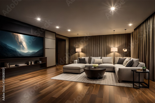 The interior design of a living room that's perfect for a movie lover, with comfortable seating and a large screen for watching films | Generative AI