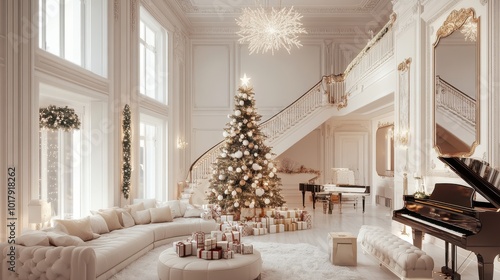 The interior living room is minimalist and comfortable,with white nuances,a Christmas tree, there are gifts under the Christmas tree,there is a sofa,a TV table,a piano.3D Rendering.