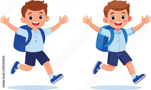 The Joyful little boy in school uniforms with backpacks, excitedly jumping and running, is a Flat cartoon illustration for education and childhood themes.