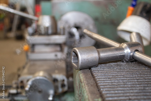 The key to the cutter against the background of the blurred silhouette of the turning machine