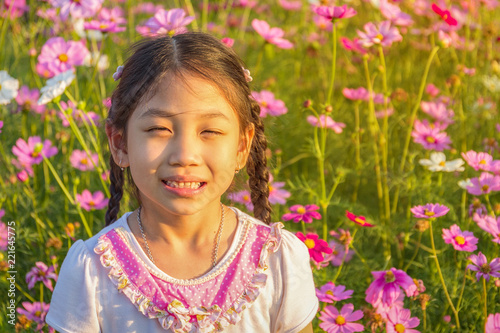 The little girl in the field of pink cosmos flower (Cosmos Bipinnatus) at sunlight in the morning