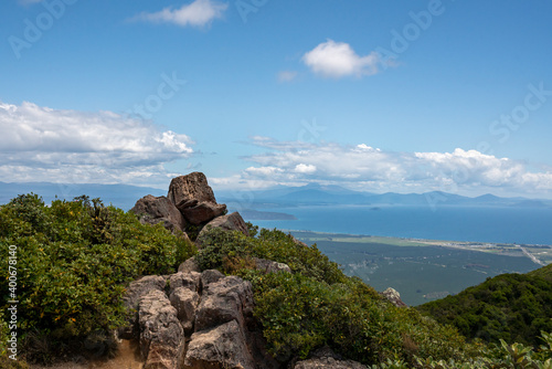 rock, nature, sky, mountain, water, island, cloud, outdoors, headland, landscape, sea, grass, hill, beach, cumulus, cliff, coast, tree, sunset, land, travel, outcrop, no one, bedrock, shoreline, summer, view, horizon, rocky, weather, nature reserve, hillside, formation, grazing, terrain, field, sun, geology, boulder, green, scenery, grassy, vegetation