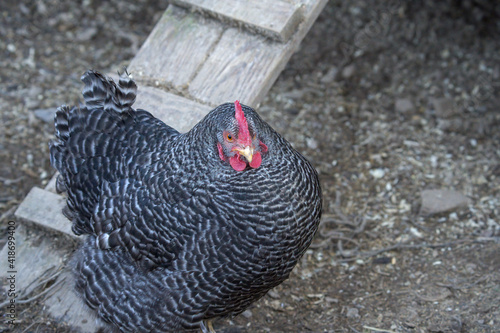 The Malines, Dutch: 'Mechelse Koekoek', a Belgian breed of large domestic chicken hen walking on a farm