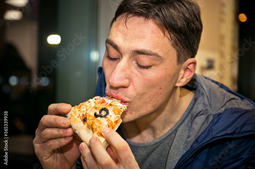 The man eating pizza. It's in the cafe. Holding a piece of pizza in hand, close-up.
