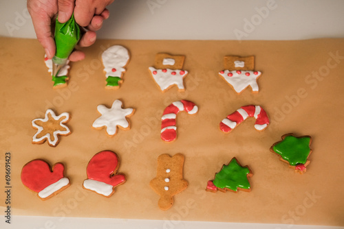 The man hands hold a pastry bag containing green icing. He cookies gingerbread cookies for Christmas. Cookies in the shape of a snowflake, snowman, and Christmas tree.