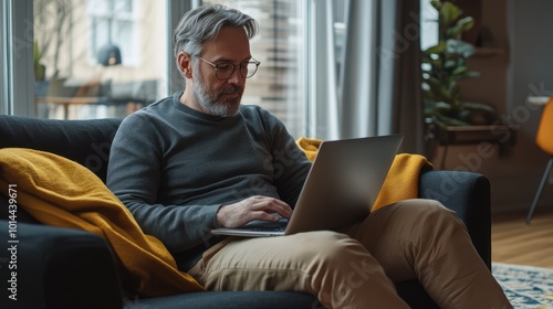 man, laptop, home, cosy, casual attire, technology, adult, working, relaxation, innovation, modern, lifestyle, living room, indoor, sofa, plant, mature, focused, remote, connection, online, reading, cyberspace, communication, writing, concentration, comfort, leisure, goggles, stylish, productivity
