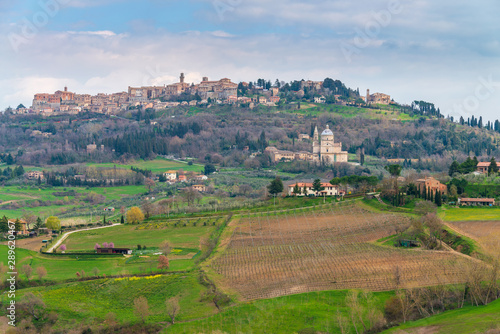 The medieval Montepulciano town on the hill and Church of San Biagio at Tuscany area, Italy.