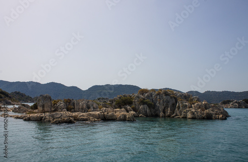the Mediterranean Sea with rocky boulders off the coast of Turkey