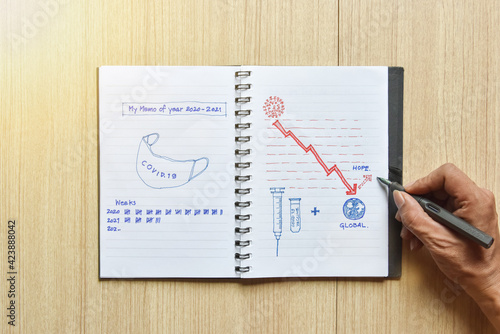 The memo of covid 19 passed years diary on wooden floor, The diaries of covid-19 showing graphic sketch of mask, vaccine and hope, global economy, virus and quarantine of wood floor