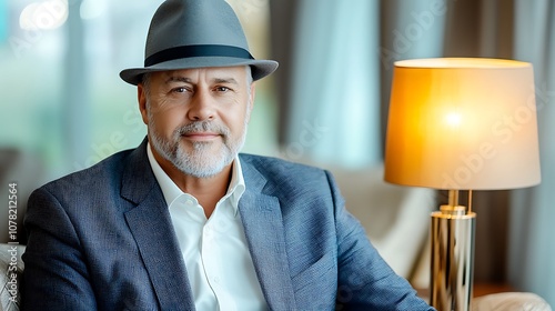 The middle aged man, dressed in a crisp suit and a stylish hat, sits comfortably on the luxurious sofa with a gentle glow emanating from the elegant lamp beside him