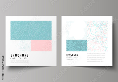 The minimal vector illustration of editable layout of two square format covers design templates for brochure, flyer, magazine. Topographic contour map, abstract monochrome background.