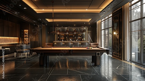 The minimalist modern decor of this billiards lounge offers a sleek and refined ambiance. copy space for text.