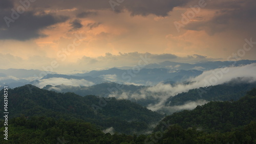 The morning fog evaporating from the valley of the Phetchaburi river and can be seen in the early morning from the viewpoints at Panoenthung. Kaeng Krachan national park. Petchaburi province,Thailand