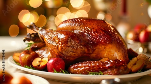 The national cuisine of Japan. Roast turkey with apples in maple sauce.