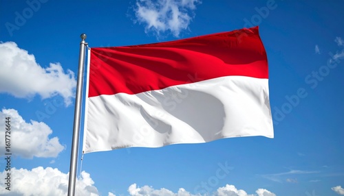 The national flag of Indonesia waving proudly on a flagpole against a backdrop of a clear blue sky with white clouds, symbolizing patriotism.