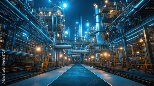 The Nichiton Era plant in a futuristic atmosphere with a high-tech structure arrangement Blue lights shine from inside