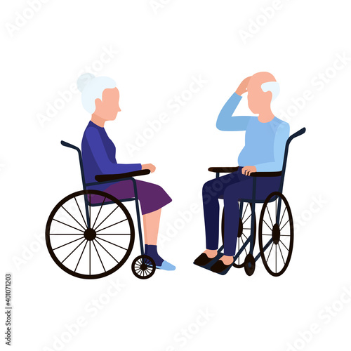 The old man and the old woman are sitting in wheelchairs. Elderly people.
