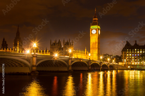 The Parliament, the Big Ben and the Westminster bridge at night, London, England