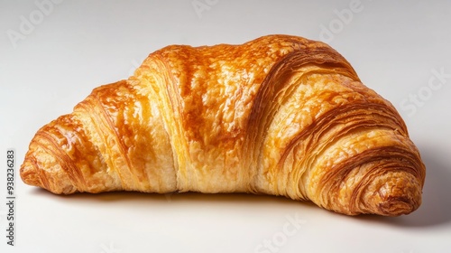 The perfectly baked croissant features a golden flaky crust, highlighting its delicious layers and appealing texture against a pristine white background