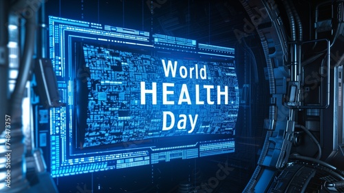 The phrase "World Health Day" in a futuristic, holographic style on a sci-fi, space station background.