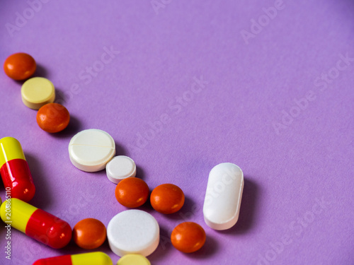 The pills are scattered on the table. Tablets on the lilac background. Medicines.