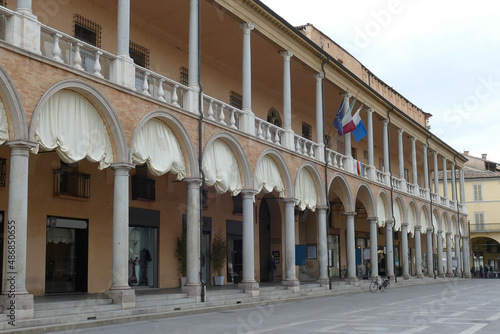 the portico of the goldsmiths in piazza del popolo in Faenza with columns in yellow Varignana's stone
